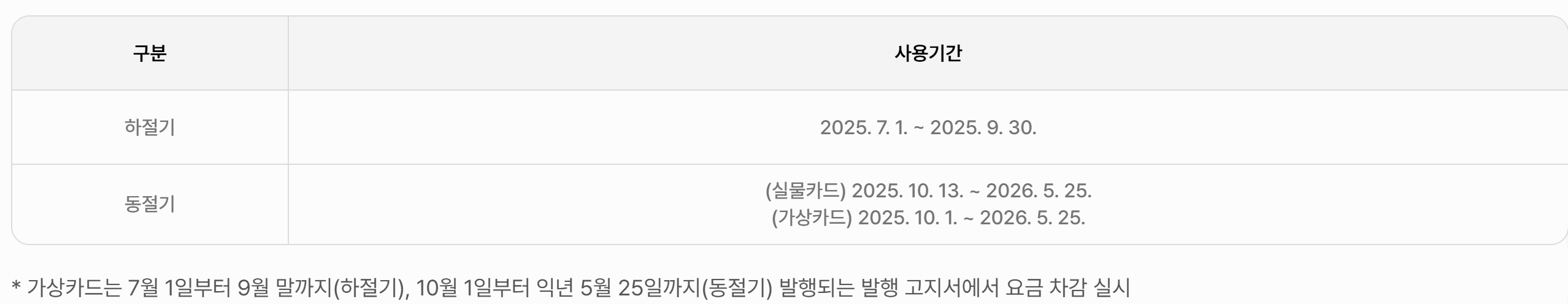 🔹 2025년 7월 1일 ~ 2026년 5월 25일까지 자유롭게 사용 가능하며, 동·하절기 구분 없이 사용됩니다.