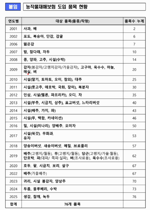농작물 재해보험은 태풍, 집중호우, 우박, 냉해, 폭염 등
